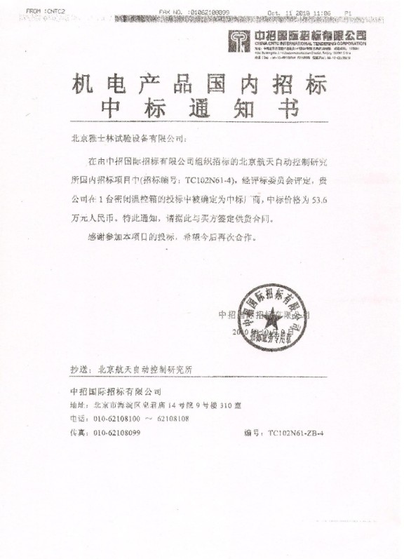 金秋十月,秋高氣爽!由中招國際招標(biāo)有限公司精心組織,在北京航天自動(dòng)控制研究所2010年國內(nèi)項(xiàng)目二期招標(biāo)中,北京雅士林試驗(yàn)設(shè)備有限公司憑借強(qiáng)大的綜合實(shí)力,以各項(xiàng)排名指標(biāo)均名列前茅的優(yōu)異成績成功中標(biāo)密閉溫控箱(招標(biāo)編號(hào):TC102N61-4)項(xiàng)目工程。中標(biāo)金額為53.6萬元人民幣。