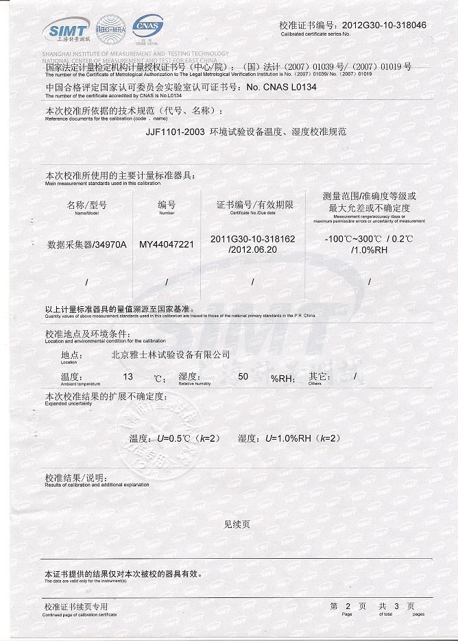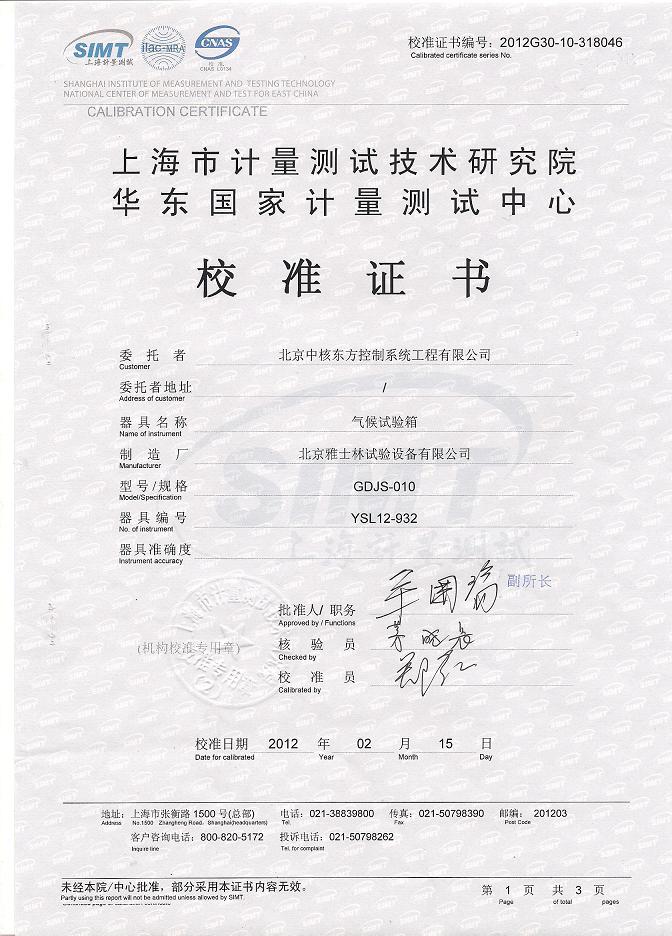 >>氣候試驗箱校準(zhǔn)證書-上海計量院-中核控制2