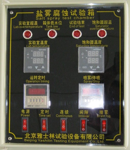 控制面板是鹽霧腐蝕試驗(yàn)箱的心臟,試驗(yàn)步驟都是通過(guò)控制面板上設(shè)定的,為了方便用戶(hù)對(duì)試驗(yàn)箱的操作,下面為您講述控制面板功能說(shuō)明: 實(shí)驗(yàn)室超溫:當(dāng)鹽霧試驗(yàn)箱工作室溫度超過(guò)試驗(yàn)設(shè)定值一定范圍時(shí),此報(bào)警燈亮。 箱體低水位:鹽霧腐蝕試驗(yàn)箱在試驗(yàn)過(guò)程中缺水時(shí),此報(bào)警燈亮。 試驗(yàn)結(jié)束:當(dāng)試驗(yàn)運(yùn)轉(zhuǎn)時(shí)間到達(dá)設(shè)定值時(shí),此燈亮(設(shè)備停止工作)。 飽和器超溫:當(dāng)飽和器溫度超出空氣開(kāi)關(guān)設(shè)定值一定范圍時(shí),此報(bào)警燈亮。 實(shí)驗(yàn)室溫度:顯示試驗(yàn)過(guò)程中實(shí)驗(yàn)室的實(shí)際溫度和設(shè)定溫度。 飽和器溫度:顯示試驗(yàn)過(guò)程中飽和器的實(shí)際溫度與設(shè)定溫度。 運(yùn)轉(zhuǎn)定時(shí):對(duì)試驗(yàn)時(shí)間進(jìn)行實(shí)時(shí)設(shè)定,試驗(yàn)時(shí)間到達(dá)設(shè)定值,設(shè)備停止運(yùn)轉(zhuǎn)。 噴霧/停噴:此定時(shí)器是噴霧時(shí)間設(shè)定、停噴時(shí)間設(shè)定、時(shí)間單位選擇。 排霧:試驗(yàn)結(jié)束時(shí),按下此按鈕,將試驗(yàn)箱內(nèi)的鹽霧氣體趕出,通過(guò)排霧口排出。 間隙:按下此按鈕,噴霧塔將按計(jì)時(shí)器設(shè)定的時(shí)間進(jìn)行間隙性噴霧。 連續(xù):按下些按鈕,噴霧塔進(jìn)行連續(xù)噴霧。 定時(shí):按下此按鈕才可以對(duì)設(shè)備進(jìn)行試驗(yàn)運(yùn)轉(zhuǎn)總時(shí)間定時(shí)。 電源:設(shè)備通電工作。