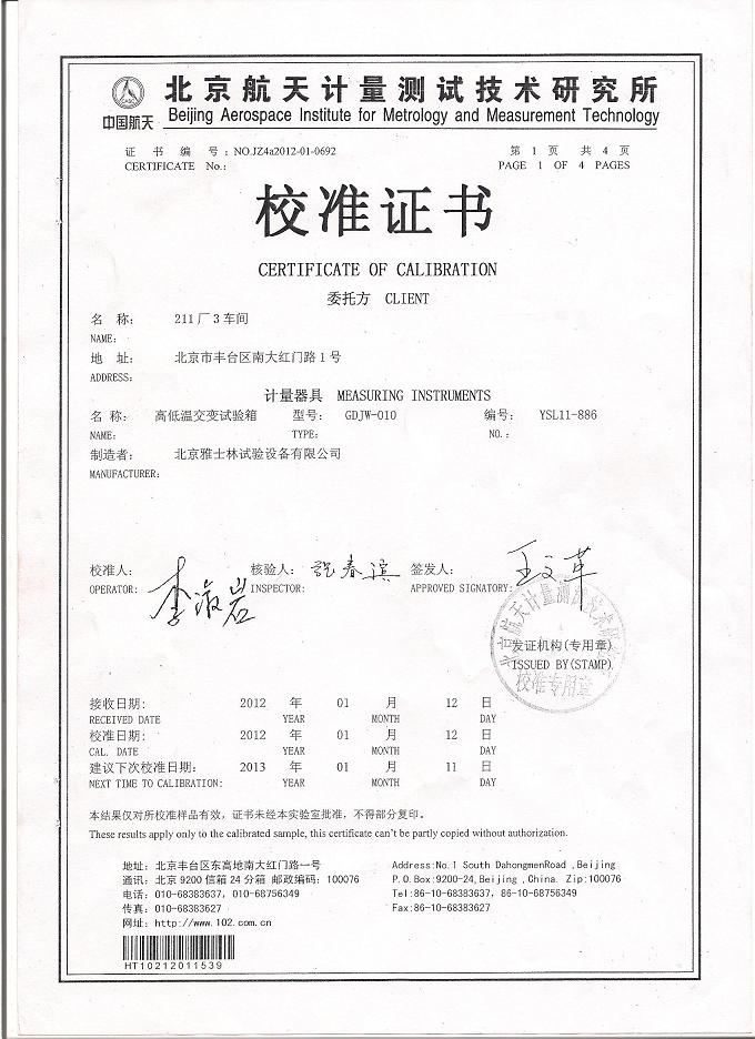 >>高低溫交變試驗(yàn)箱校準(zhǔn)證書-航天計(jì)量-航天一院