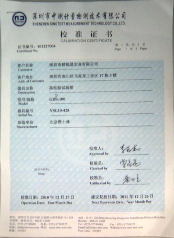 >>高低溫交變濕熱試驗箱校準證書-深圳中測計量-深圳精銳通